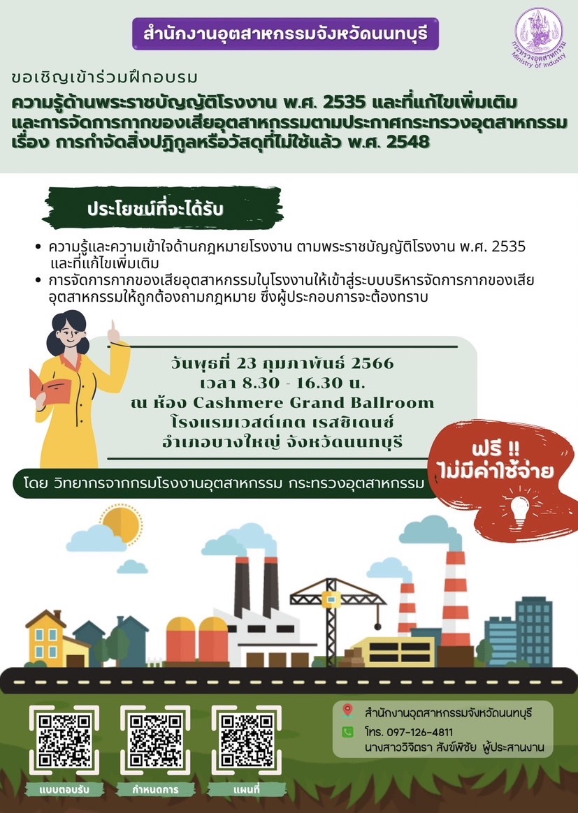 ขอเชิญเข้าร่วมฝึกอบรม!! “ความรู้ด้านพระราชบัญญัติโรงงาน พ.ศ. 2535 และที่แก้ไขเพิ่มเติม และการจัดการกากของเสียอุตสาหกรรมตามประกาศกระทรวงอุตสาหกรรมเรื่อง การกำจัดสิ่งปฏิกูลหรือวัสดุที่ไม่ใช้แล้ว พ.ศ. 2548” ฟรี!! ไม่เสียค่าใช้จ่าย