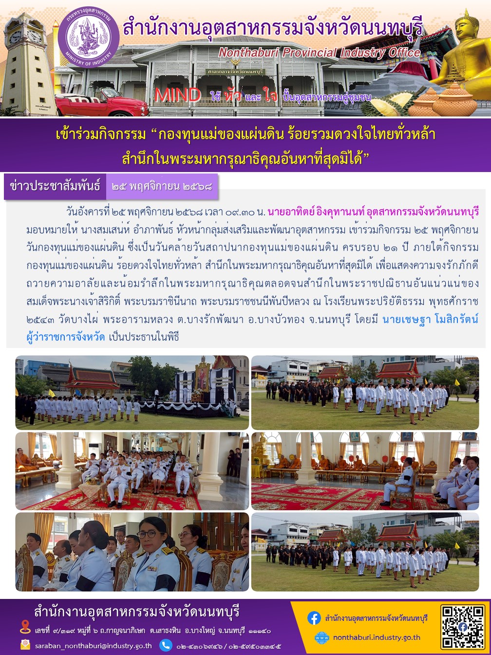 วันอังคารที่ ๒๕ พฤศจิกายน ๒๕๖๘ เวลา ๐๙.๓๐ น. นายอาทิตย์ อิงคุทานนท์ อุตสาหกรรมจังหวัดนนทบุรี มอบหมายให้ นางสมเสน่ห์ อำภาพันธ์ หัวหน้ากลุ่มส่งเสริมและพัฒนาอุตสาหกรรม เข้าร่วมกิจกรรม ๒๕ พฤศจิกายน วันกองทุนแม่ของแผ่นดิน