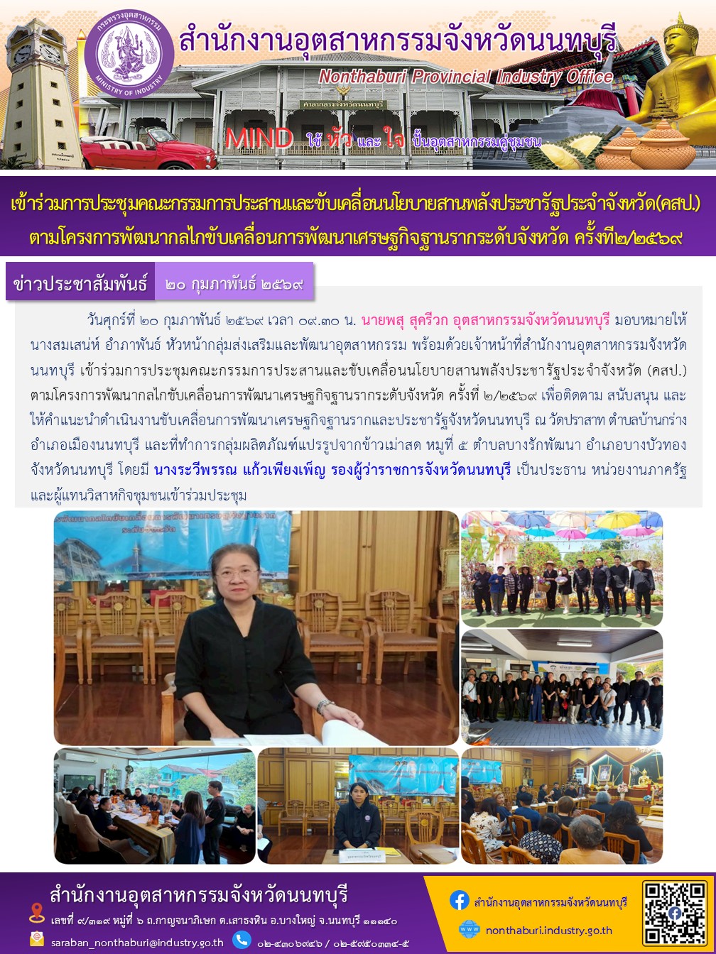 วันศุกร์ที่ ๒๐ กุมภาพันธ์ 2569 เวลา ๐๙.30 น. นายพสุ สุครีวก อุตสาหกรรมจังหวัดนนทบุรี มอบหมายให้ นางสมเสน่ห์ อำภาพันธ์ หัวหน้ากลุ่มส่งเสริมและพัฒนาอุตสาหกรรม พร้อมด้วยเจ้าหน้าที่สำนักงานอุตสาหกรรมจังหวัดนนทบุรี เข้าร่วมการประชุมคณะกรรมการประสานและขับเคลื่อนนโยบายสานพลังประชารัฐประจำจังหวัด (คสป.) ตามโครงการพัฒนากลไกขับเคลื่อนการพัฒนาเศรษฐกิจฐานรากระดับจังหวัด ครั้งที่ 2/2569