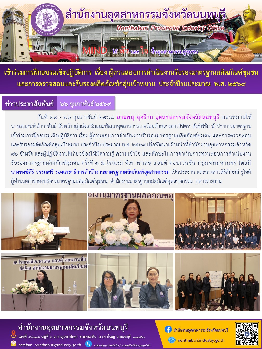 วันที่ 24 - 26 กุมภาพันธ์ 2569 นายพสุ สุครีวก อุตสาหกรรมจังหวัดนนทบุรี มอบหมายให้ นางสมเสน่ห์ อำภาพันธ์ หัวหน้ากลุ่มส่งเสริมและพัฒนาอุตสาหกรรม พร้อมด้วยนางสาววิจิตรา สังข์พิชัย นักวิชาการมาตรฐาน เข้าร่วมการฝึกอบรมเชิงปฏิบัติการ เรื่อง ผู้ทวนสอบการดำเนินงานรับรองมาตรฐานผลิตภัณฑ์ชุมชน และการตรวจสอบและรับรองผลิตภัณฑ์กลุ่มเป้าหมาย ประจำปีงบประมาณ พ.ศ. 2569 เพื่อพัฒนาเจ้าหน้าที่สำนักงานอุตสาหกรรมจังหวัด 76 จังหวัด และผู้ปฏิบัติงานที่เกี่ยวข้องให้มีความรู้ ความเข้าใจ และทักษะในการดำเนินการทวนสอบการดำเนินงานรับรองมาตรฐานผลิตภัณฑ์ชุมชน ครั้งที่ 1 ณ โรงแรม ทีเค. พาเลซ แอนด์ คอนเวนชั่น กรุงเทพมหานคร โดยมี นางพงษ์ศิริ วรรณศรี รองเลขาธิการสำนักงานมาตรฐานผลิตภัณฑ์อุตสาหกรรม เป็นประธาน และนางสาวสิริลักษณ์ ชูโชติ ผู้อำนวยการกองบริหารมาตรฐานผลิตภัณฑ์ชุมชน สำนักงานมาตรฐานผลิตภัณฑ์อุตสาหกรรม กล่าวรายงาน
