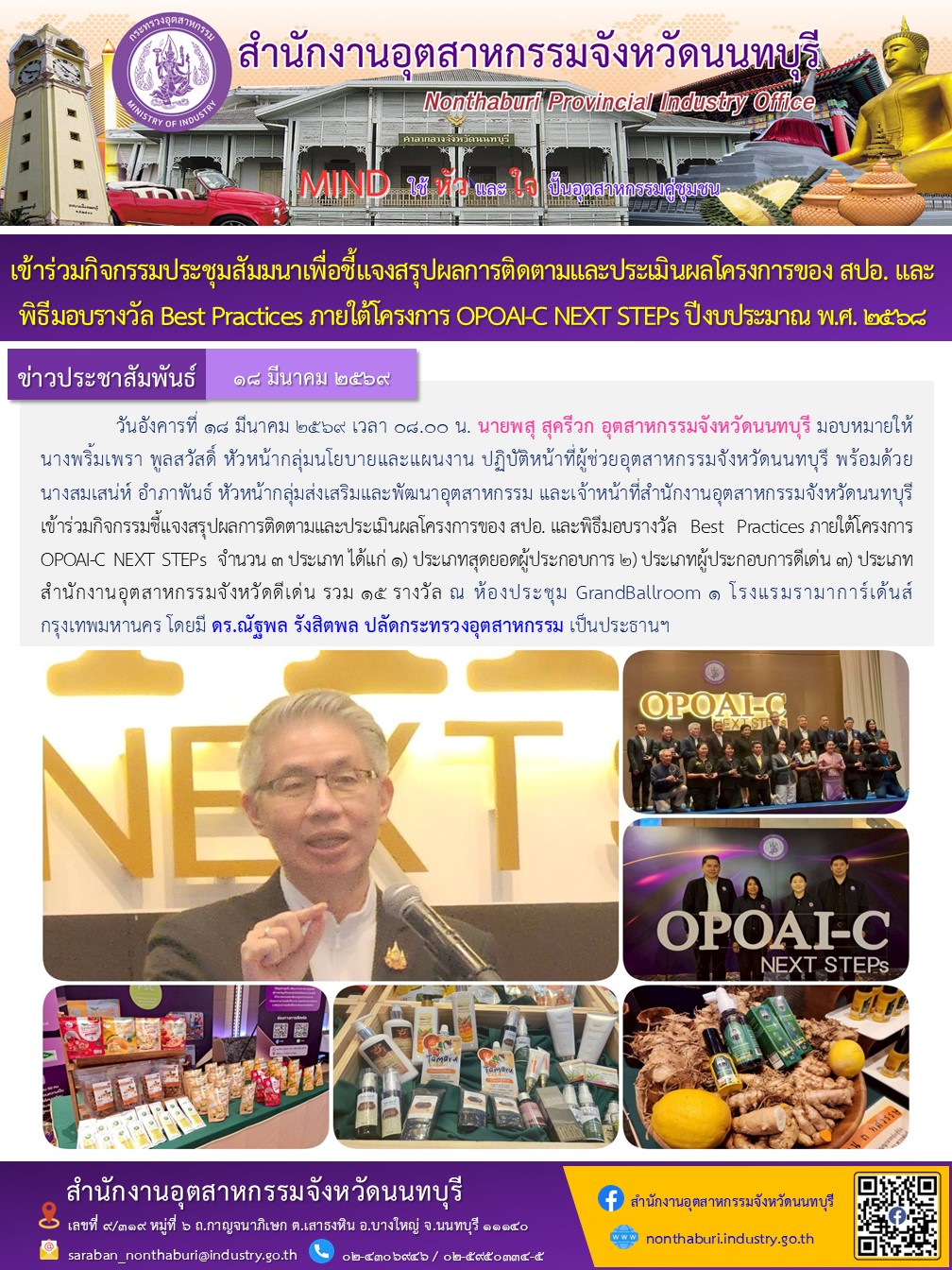 วันอังคารที่ ๑๘ มีนาคม 2569 เวลา ๐๘.๐0 น. นายพสุ สุครีวก อุตสาหกรรมจังหวัดนนทบุรี มอบหมายให้ นางพริ้มเพรา พูลสวัสดิ์ หัวหน้ากลุ่มนโยบายและแผนงาน ปฏิบัติหน้าที่ผู้ช่วยอุตสาหกรรมจังหวัดนนทบุรี พร้อมด้วย นางสมเสน่ห์ อำภาพันธ์ หัวหน้ากลุ่มส่งเสริมและพัฒนาอุตสาหกรรม และเจ้าหน้าที่สำนักงานอุตสาหกรรมจังหวัดนนทบุรี เข้าร่วมกิจกรรมชี้แจงสรุปผลการติดตามและประเมินผลโครงการของ สปอ. และพิธีมอบรางวัล Best Practices ภายใต้โครงการ OPOAI-C NEXT STEPs