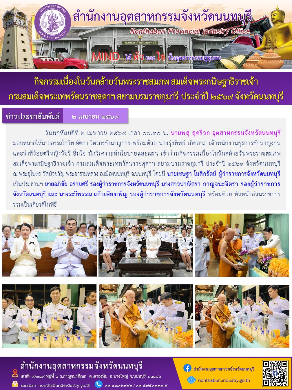 วันพฤหัสบดีที่ 2 เมษายน 2569 เวลา 06.30 น. นายพสุ สุครีวก อุตสาหกรรมจังหวัดนนทบุรี มอบหมายให้นายอรรถโกวิท หัดกา วิศวกรชำนาญการ พร้อมด้วย นางรุ่งทิพย์ เกิดลาภ เจ้าพนักงานธุรการชำนาญงาน และว่าที่ร้อยตรีหญิงวัชรี อิ่มใจ นักวิเคราะห์นโยบายและแผน เข้าร่วมกิจกรรมเนื่องในวันคล้ายวันพระราชสมภพ สมเด็จพระกนิษฐาธิราชเจ้า กรมสมเด็จพระเทพรัตนราชสุดาฯ สยามบรมราชกุมารี ประจำปี 2569 จังหวัดนนทบุรี ณ พระอุโบสถ วัดบัวขวัญ พระอารามหลวง อ.เมืองนนทบุรี จ.นนทบุรี โดยมี นายเชษฐา โมสิกรัตน์ ผู้ว่าราชการจังหวัดนนทบุรี เป็นประธานฯ นายอภิชัย อร่ามศรี รองผู้ว่าราชการจังหวัดนนทบุรี นางสาวปาณิสรา กาญจนะจิตรา รองผู้ว่าราชการจังหวัดนนทบุรี และ นางระวีพรรณ แก้วเพียงเพ็ญ รองผู้ว่าราชการจังหวัดนนทบุรี พร้อมด้วย หัวหน้าส่วนราชการ ร่วมเป็นเกียรติในพิธี
