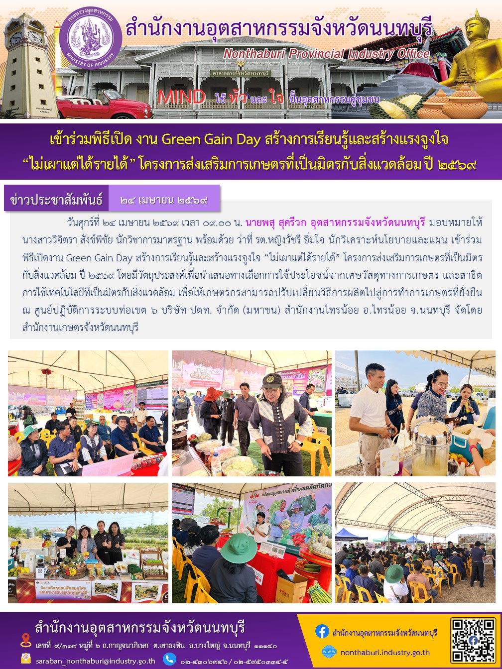 วันศุกร์ที่ 24 เมษายน 2569 เวลา 09.00 น. นายพสุ สุครีวก อุตสาหกรรมจังหวัดนนทบุรี มอบหมายให้ นางสาววิจิตรา สังข์พิชัย นักวิชาการมาตรฐาน พร้อมด้วย ว่าที่ รต.หญิงวัชรี อิ่มใจ นักวิเคราะห์นโยบายและแผน เข้าร่วมพิธีเปิดงาน Green Gain Day สร้างการเรียนรู้และสร้างแรงจูงใจ “ไม่เผาแต่ได้รายได้”