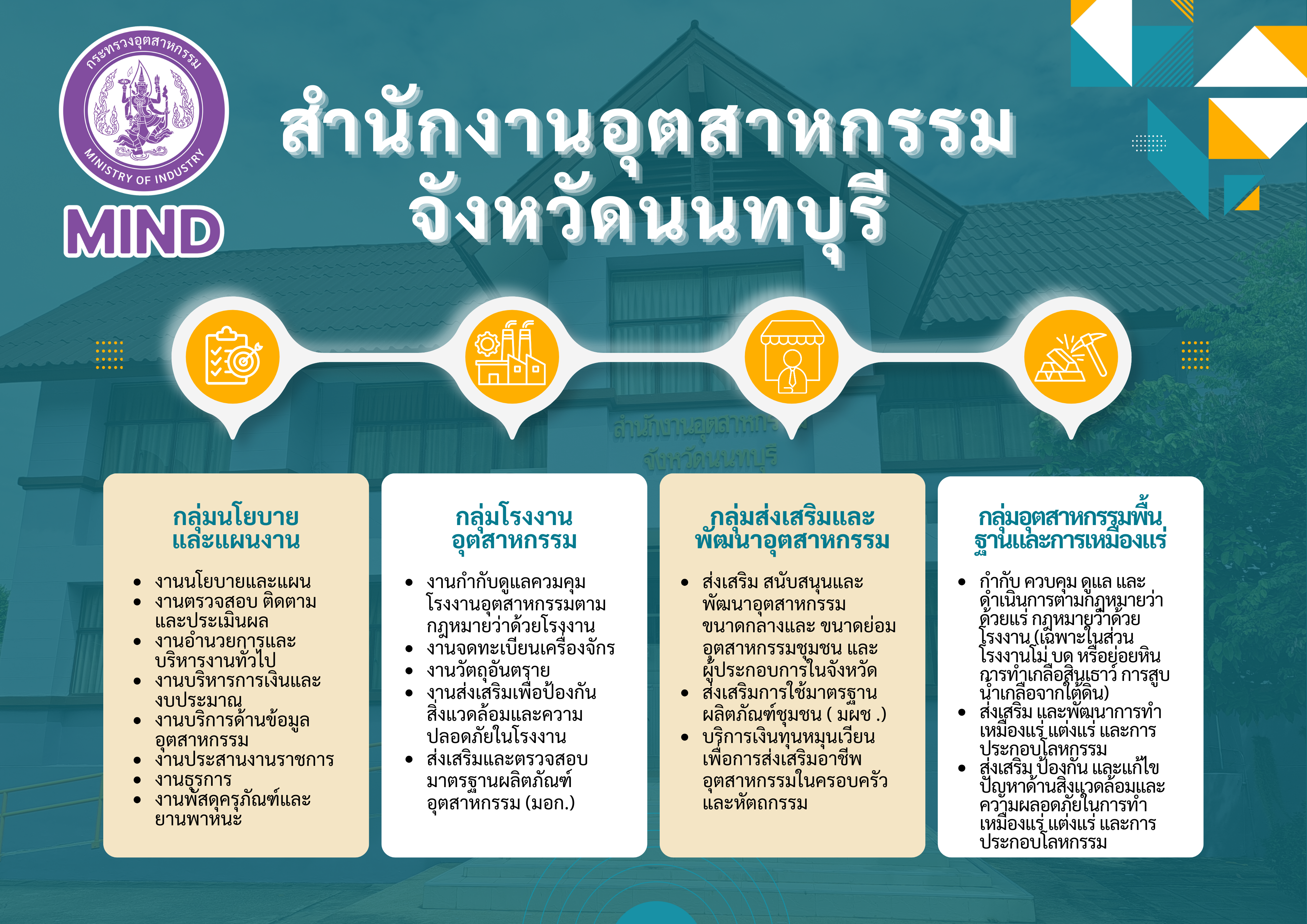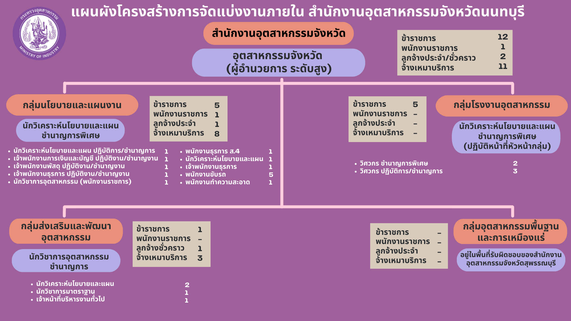 สำนักงานอุตสาหกรรมจังหวัดนนทบุรี แบ่งโครงสร้างภายในออกเป็น 4 กลุ่ม ดังนี้